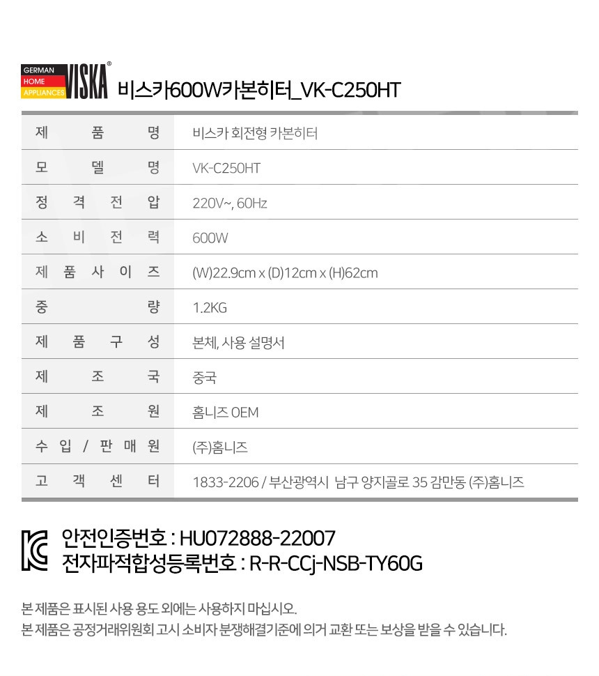 비스카 2단 회전형 카본히터 VK-C250HT